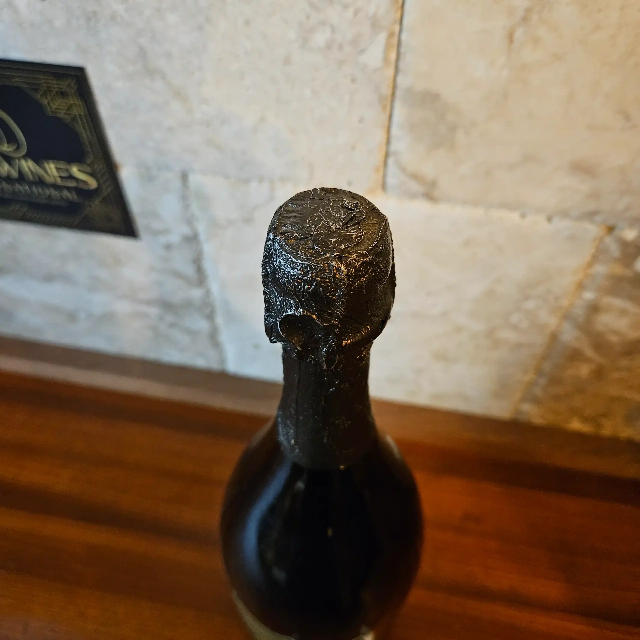 Stored on its side in a climate-controlled cellar.