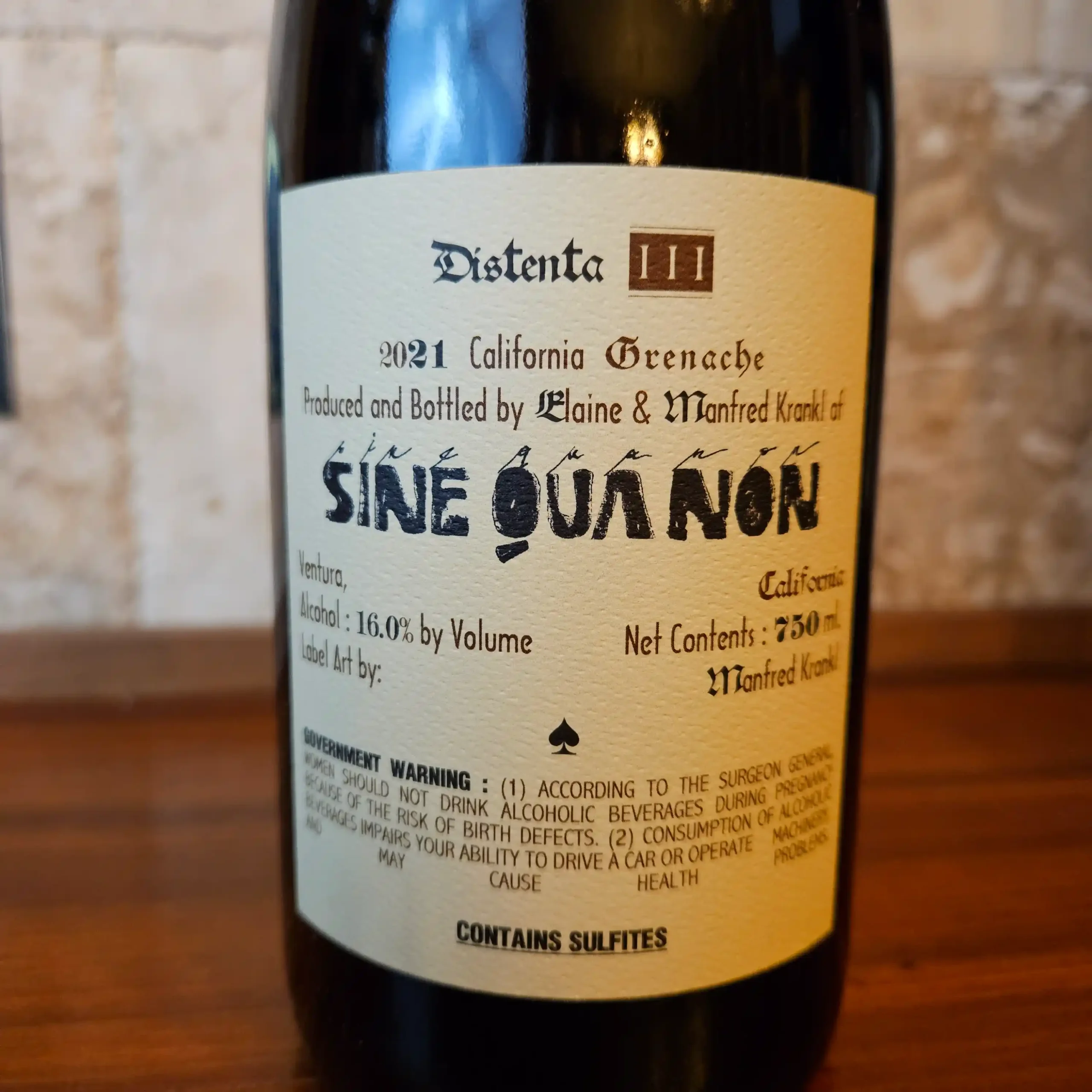 Since its founding in 1994 by Manfred and Elaine Krankl, Sine Qua Non has redefined the concept of “cult” winemaking in California’s Central Coast. Manfred, an Austrian emigrant who co-founded the legendary Campanile restaurant and La Brea Bakery, began his winemaking journey in an industrial Ventura warehouse—a facility Robert Parker famously likened to a “Mad Max” movie set. The winery is celebrated for its radical rejection of consistency; every vintage of their flagship Syrah and Grenache receives a unique name, an original woodcut-printed label designed by Manfred, and a bespoke bottle shape. The 2021 release, “Distenta III” (a name derived from the Latin for “unlabeled” or “unfettered”), reflects the winery’s ultimate transition toward 100% estate-grown fruit. Sourced primarily from the Eleven Confessions, The Third Twin, and Cumulus vineyards, the wine embodies the Krankls’ philosophy that winemaking is an artistic endeavor that should never be bound by a repetitive recipe.