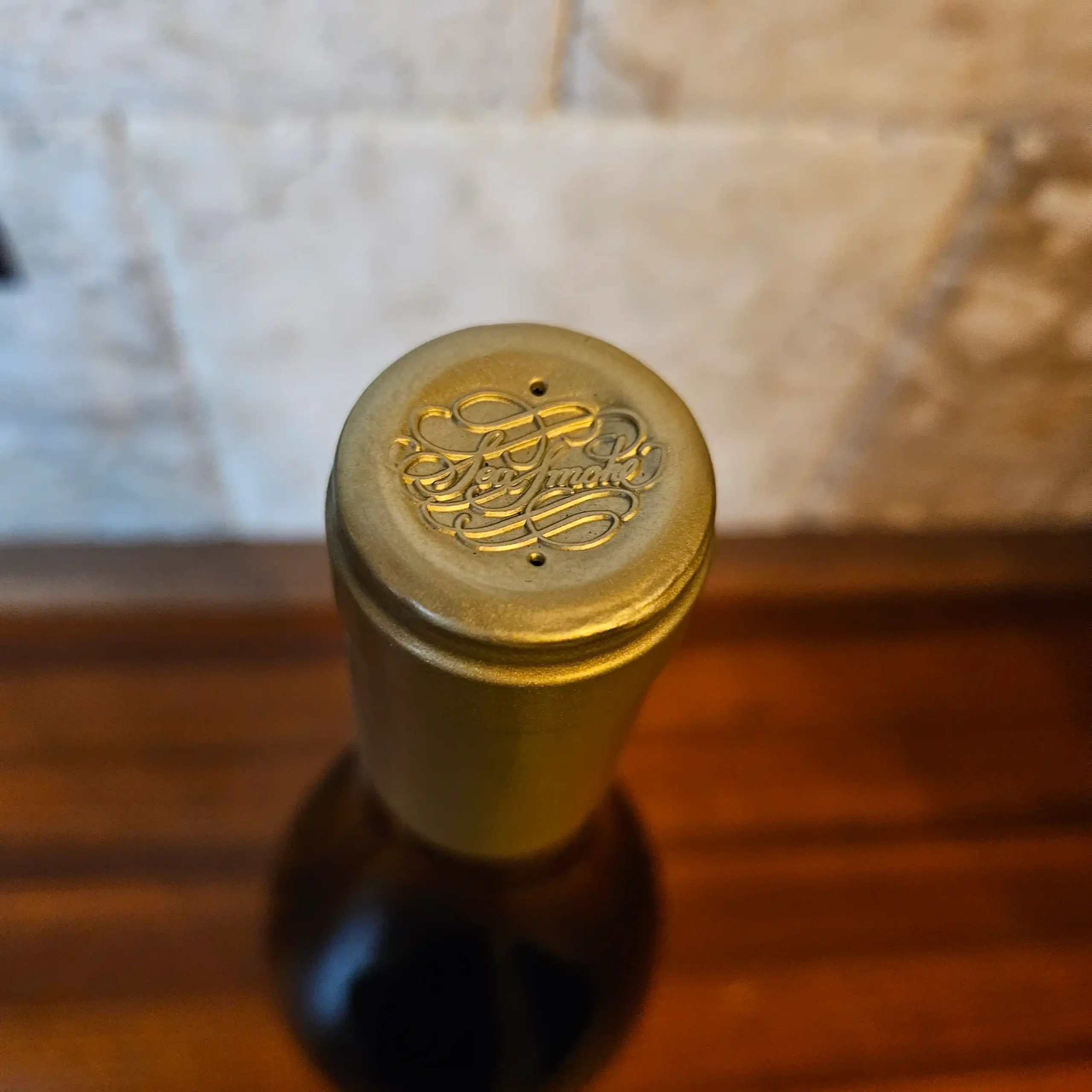 Always stored on its side in a climate-controlled cellar.